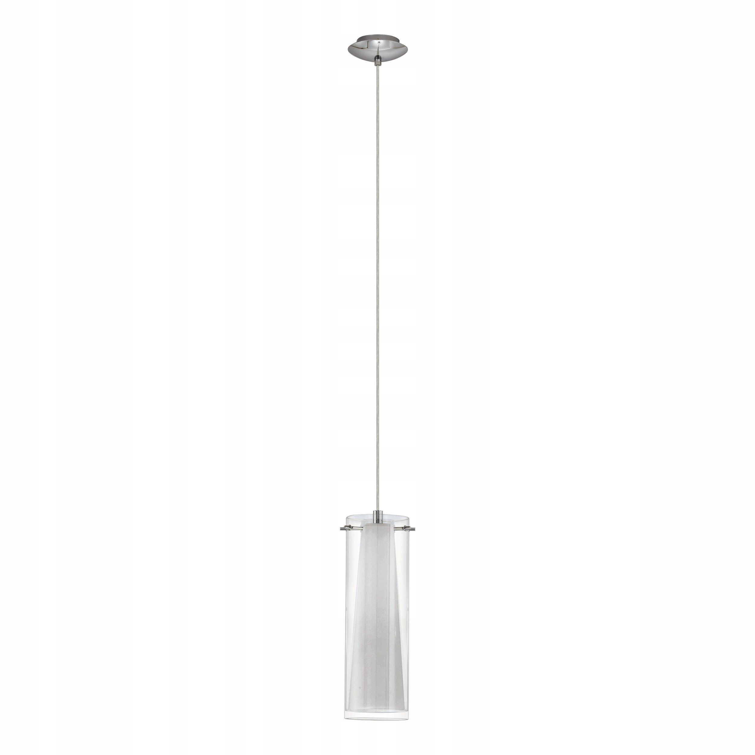 Одиночний підвісний світильник серії PINTO складається з циліндричного абажура. з прозорого скла і білого конусоподібного скляного абажура, розміщеного всередині. Обшивка стелі та ручки виготовлені з хромованого металу. Завдяки незмінному дизайну світильник можна поєднати майже з будь-яким стилем інтер’єру та забезпечує сучасне освітлення.