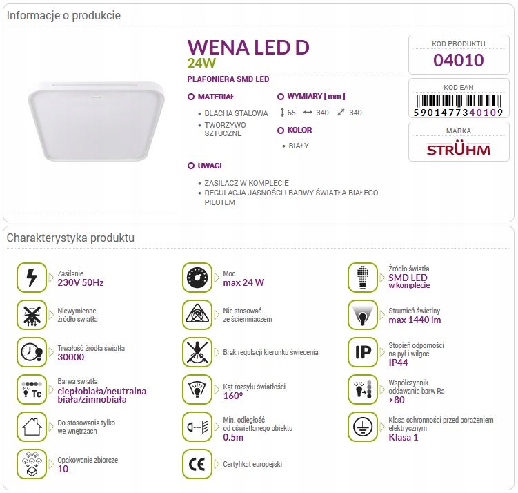 Просматривая «Світильник стельовий WENA LED D 24W + пульт 04010 Struhm», вы можете быть уверены, что данный товар из каталога «Полуплафоны и плафоны» будет доставлен из Польши и проверен на целостность. В цене товара, указанной на сайте, учтена доставка из Польши. Внимание!!! Товары для Евросоюза, согласно законодательству стран Евросоюза, могут отличаться упаковкой или наполнением.