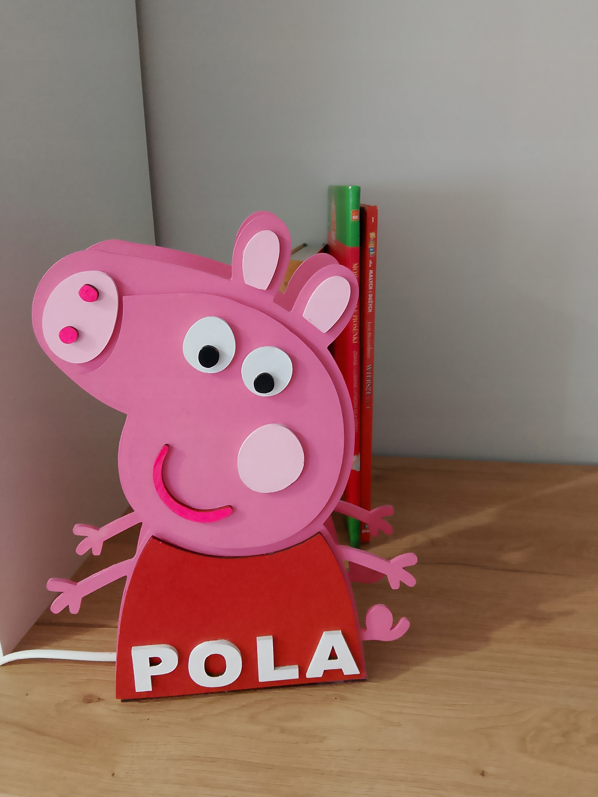 Дерев'яний світильник для дитячої кімнати з мотивом свинки Пеппи та ім'ям дитини.