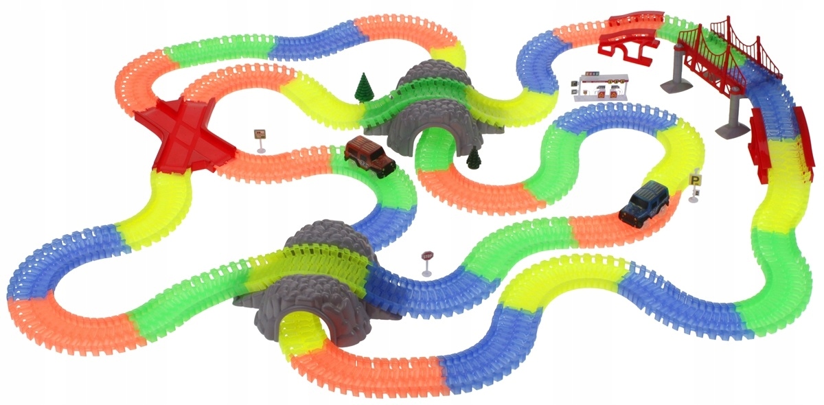 Автотрек подарує вашій дитині багато годин чудового задоволення. Завдяки високій гнучкості елементи гусениці можна переміщати, обертати, піднімати, змінювати напрямок і розташовувати в будь-якій комбінації. Кожен трековий елемент є роз'ємним, тому його легко збирати і розбирати. У темряві, під впливом вогнів автомобіля, що рухається, траса виглядає так, ніби вона світиться. Граючи, дитина може розвивати мануальні, будівельні та творчі навички.