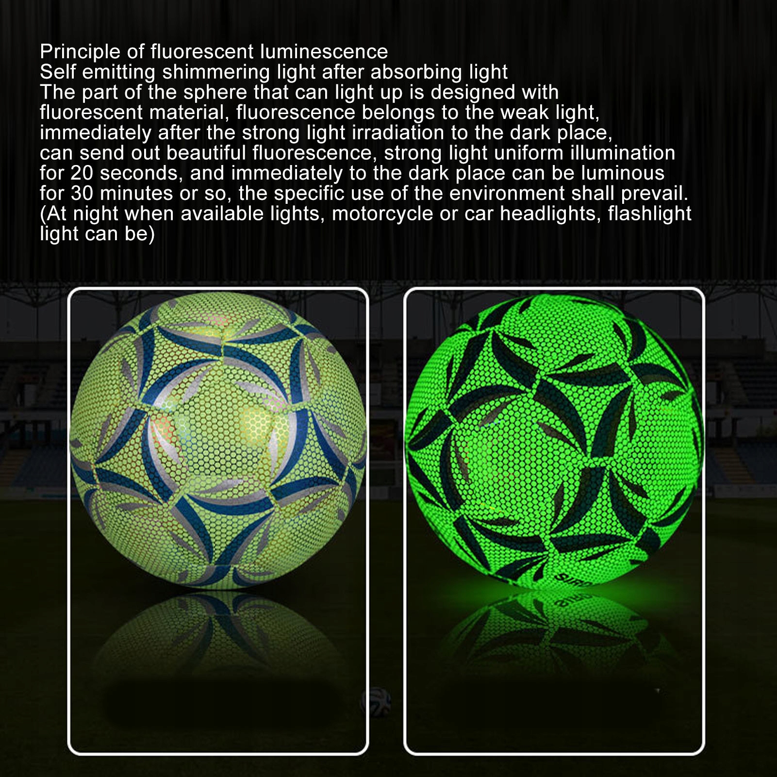 Функція:1. ФУНКЦІЯ СВІТЛА: цей футбольний м’яч має світловідбиваючу функцію, яка дозволяє йому світитися в умовах слабкого освітлення, покращуючи видимість, роблячи гру безпечнішою та приємнішою вночі або на погано освітлених полях.