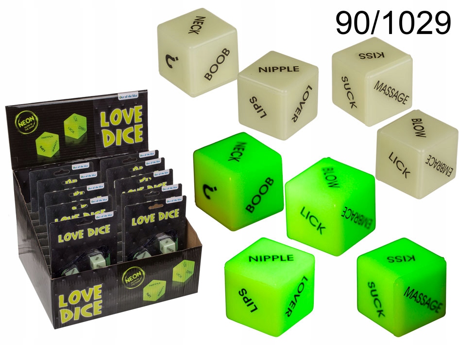 Дві кістки любові світилися в темряві. Ідеальна ідея для романтичного подарунка на двох. Одна кістка описує в якій частині тіла, а другу, що робити (написи англійською мовою). Невеликий гаджет, який дозволяє грати в гру між закоханими.