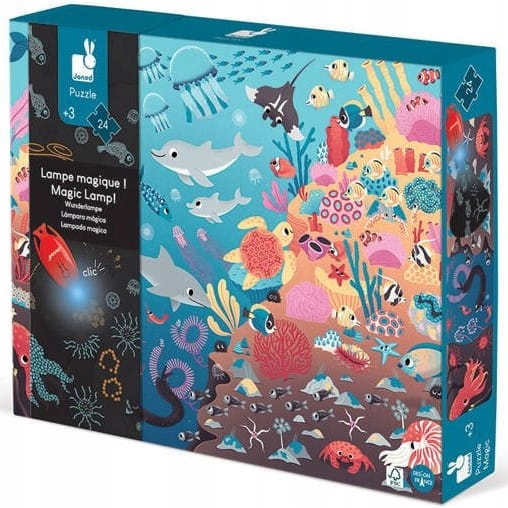 Набір чарівних пазлів Океан від французького бренду JANOD складається з 24 елементів, які складаються так, щоб створювати чарівне, барвисте, досить великого розміру (65 x 50 см) і багате на деталі зображення, яке показує підводні глибини, повні океанської фауни та флори.