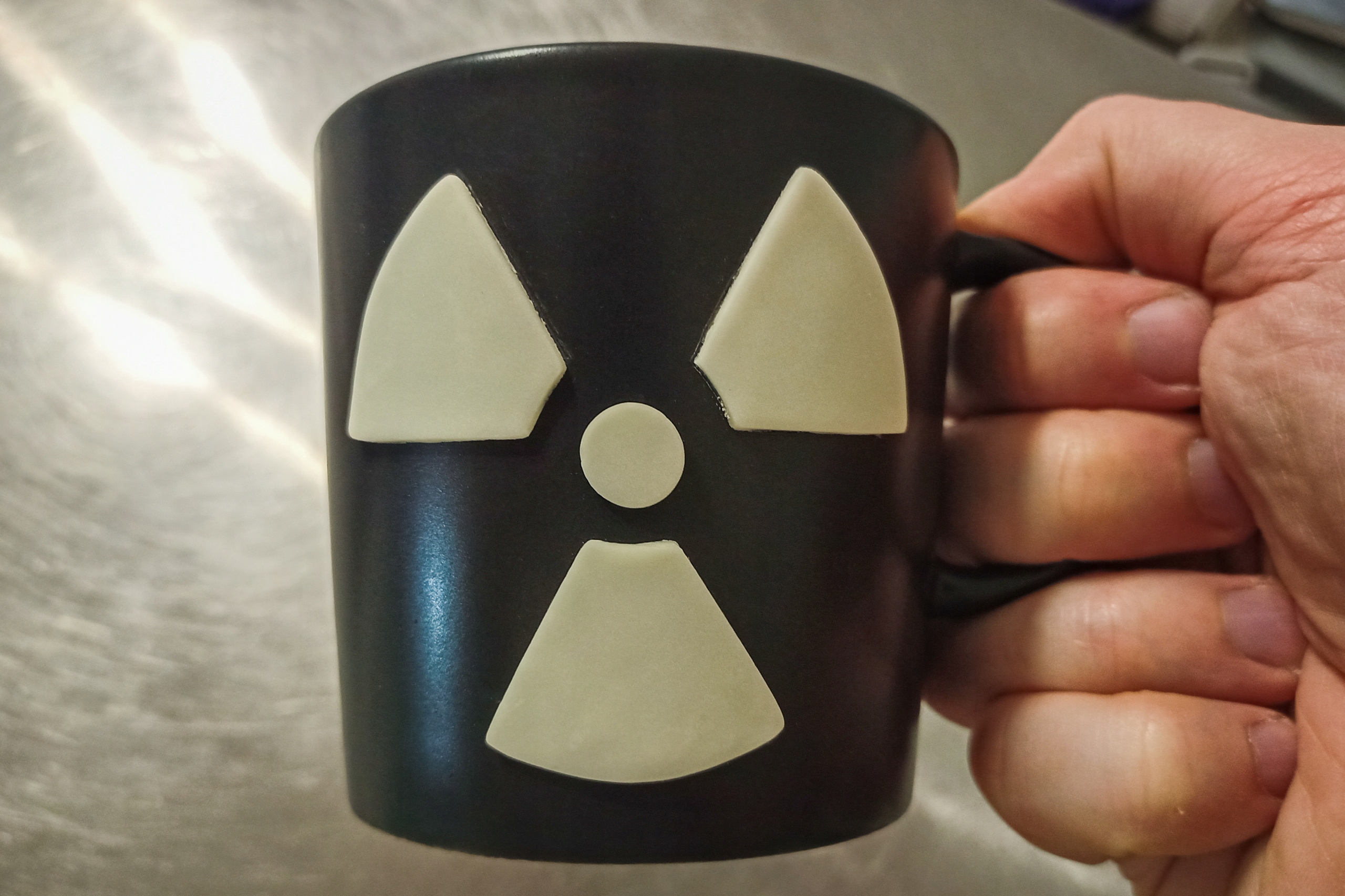 Кухоль із графіту з керамічним знаком радіоактивності, що виступає, і світиться зеленим у темряві (звичайно, після впливу світла). Візерунок виготовлений вручну, тому це дуже обмежене видання, і їх ніколи не буде багато. Кружка має форму, яка відрізняє її від більшості інших доступних. Ємність 300 мл.
