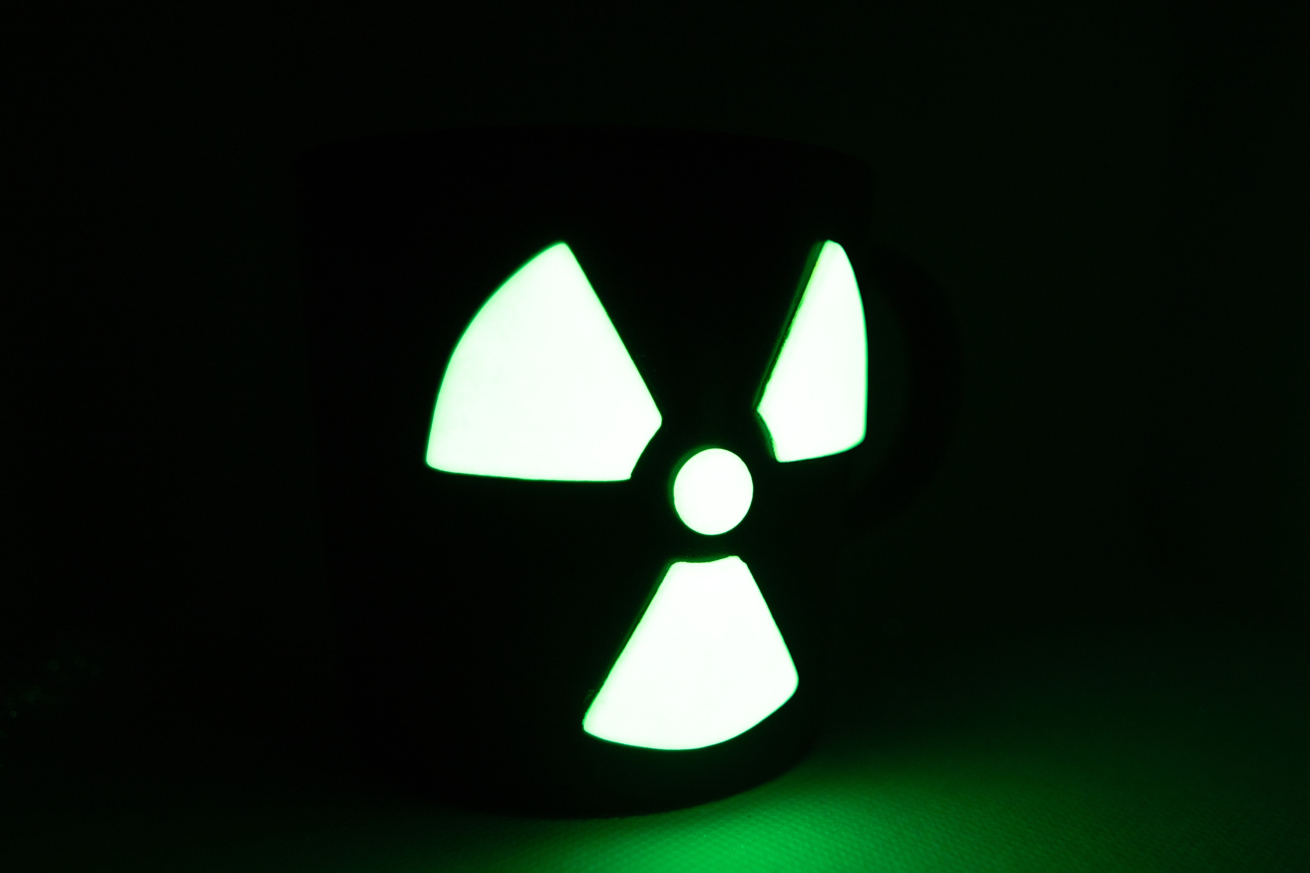 Кухоль зі знаком радіоактивності, що світиться в темряві