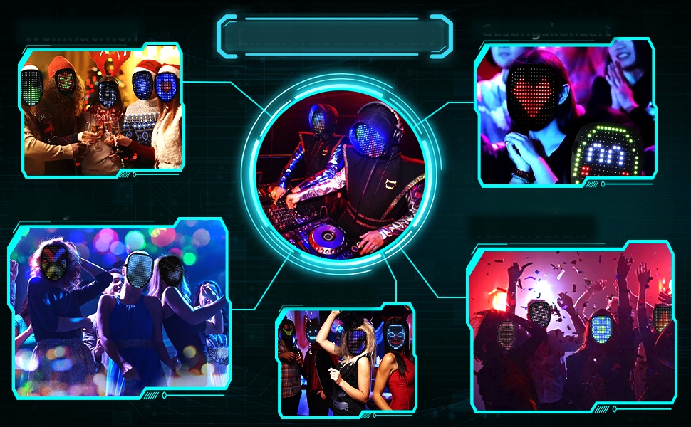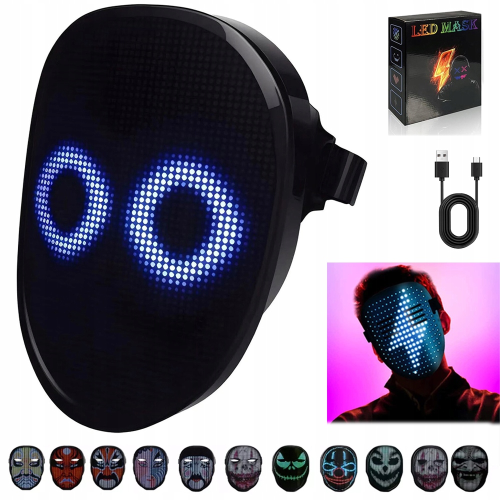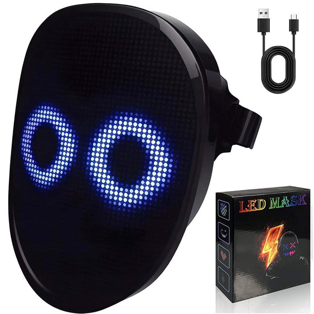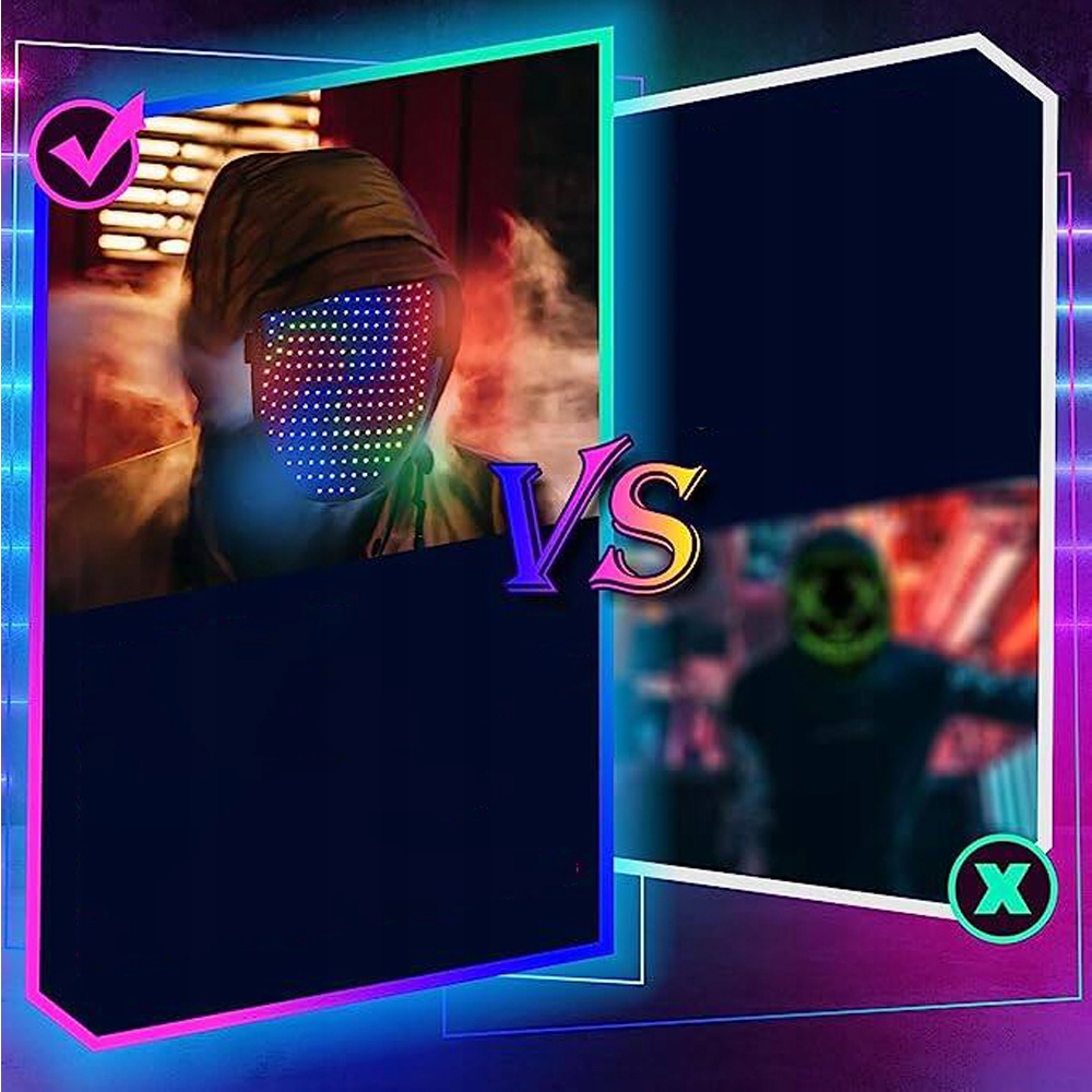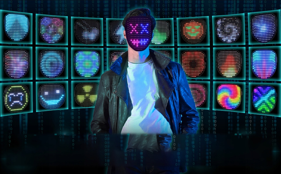 ⏭️⏭️50 шаблонів відображення –Світлодіодна маска має 25 динамічних режимів відображення та 25 статичних зображень, світлодіодну маску можна налаштувати на один колір, спалах, градієнт кольору, плавний і багатоколірний, спалах, градієнт кольору, плавність. Світлодіодна маска для обличчя - це найдивовижніші костюми та косплей-маски, які привертають увагу кожного.