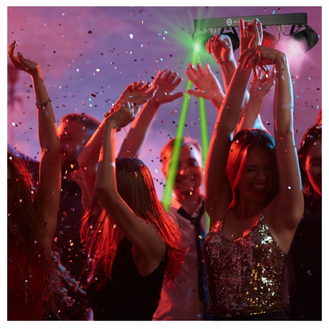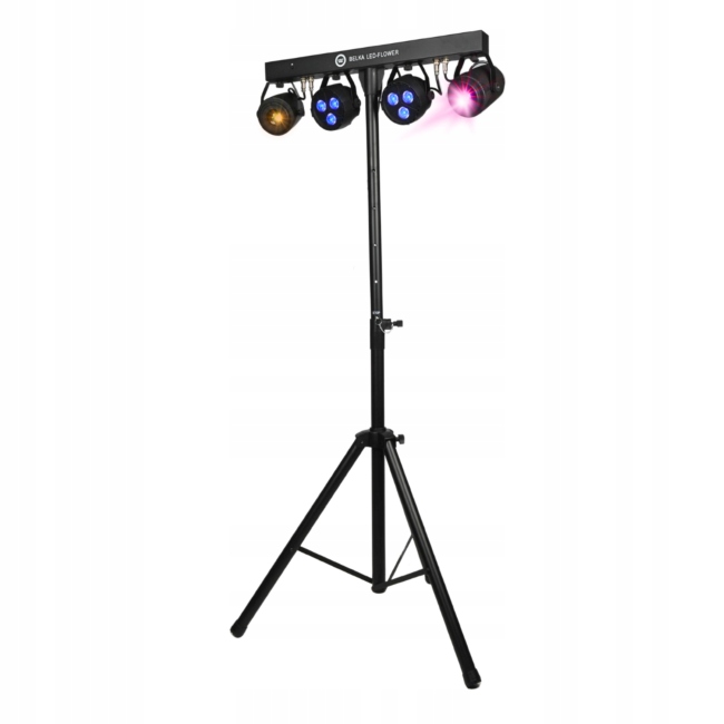 Набір включає міцний штатив, кріплення смужки та дві мультикольорові світлодіодні партії (12x1w rgbw) та два світлодіодні ефекти освітлення квітки (1x10w rgbw), постійно з'єднані з балок , забезпечуючи широкий кут освітлення. Роботу цілого можна керувати рукою, використовуючи смугу світлодіод і чотири кнопки (меню, вгору, вниз, введіть), через бездротові дистанційні керування або за допомогою контролерів dmx (в/вихідних соків). Пристрій також має вбудовану автоматичну роботу та контроль звуку (вбудований мікрофон).