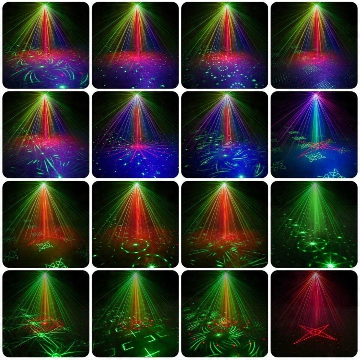 Оновіть вечірнє лазерне світло, щоб отримати 60 комбінацій зображень, 6 кольорів фону (червоний, зелений, синій, червоний і зелений, червоний синій, синій і зелений) і 3 комбінації променів (зелений, червоний, зелений і червоний), створюючи більш захоплюючу сценічну атмосферу завдяки поєднанню багатьох ефектів і якості проекції високої чіткості.