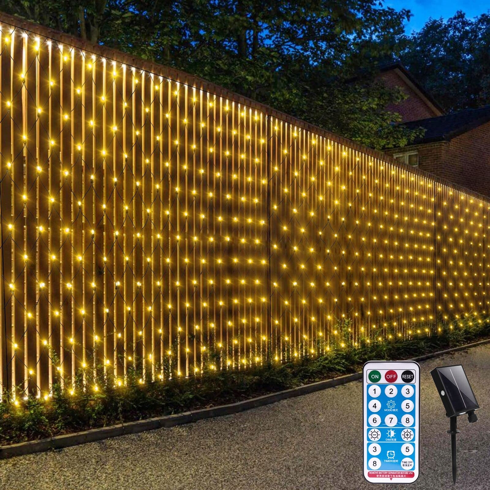 - Дистанційне керування та 8 режимів: ви можете вільно керувати цими сітчастими ліхтарями за допомогою дистанційного керування. Сітчастий сонячний ліхтар має 8 режимів освітлення: комбінований, хвилястий, послідовний, ривок, гонитва/блимання, повільне згасання, мерехтіння/спалах і постійне світло. Ви можете встановити його як 3/5/8H для автоматичного регулярного вмикання/вимикання.