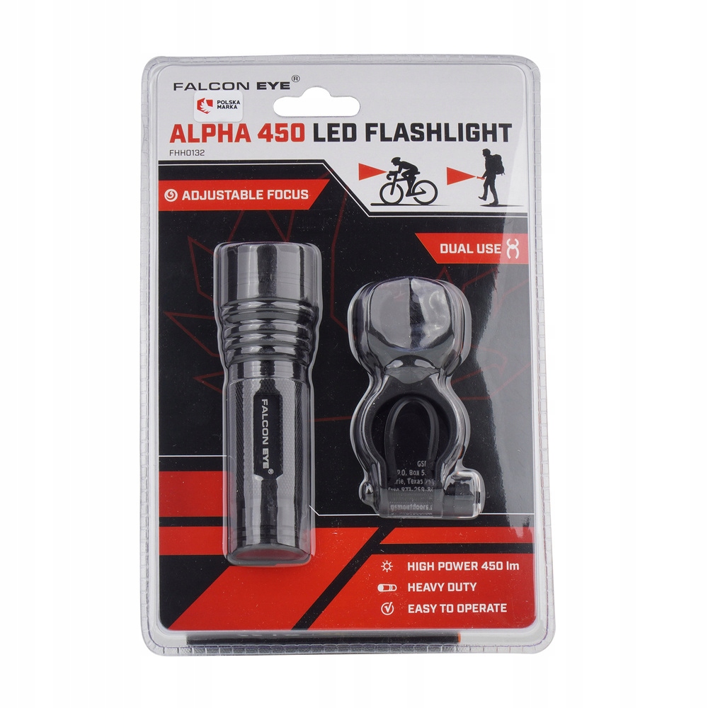 Alpha Falcon Eye - це компактний світлодіодний ліхтарик, виготовлений з міцного і стійкого до повітряного алюмінію. Забезпечує потужність 450 ЛМ і завдяки функції фокусування, яка дозволяє змінити фокусування променя випромінюваного світла на 180 м світлового діапазону. Таким чином, користувач може вибрати відстань, щоб освітлити ліхтарик Alpha Alpha Falcon Eye.