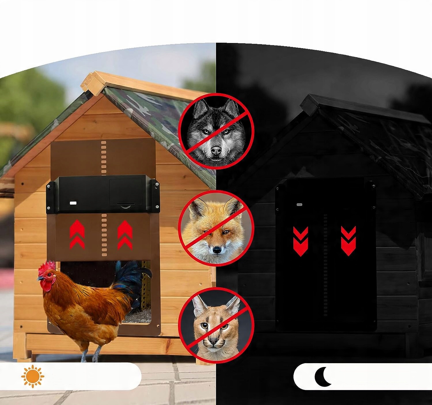 🦃 【Широкий спектр застосування】- b>Розмір автоматичних дверцят для курчат 35 х 24 см, дверна коробка підібрана, монтаж безпосередньо узгоджується з фарбуванням. Будь ласка, ретельно контролюйте затягування гвинтів, інакше це може вплинути на підйом дверей.