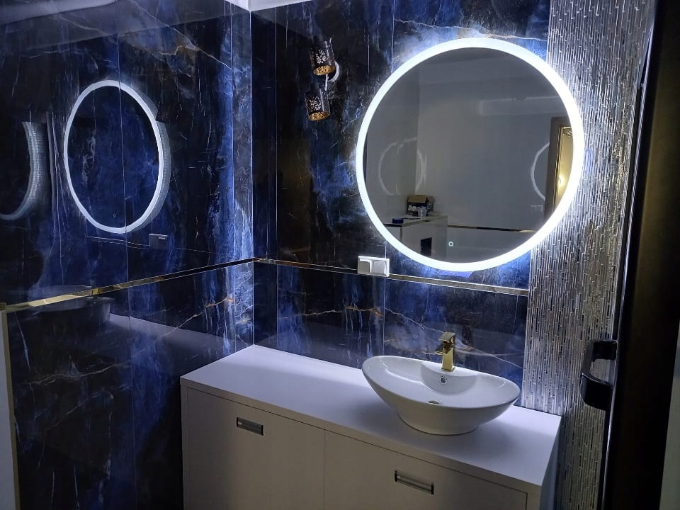 Сучасне кругле дзеркало світлодіод Fi 70 см світлодіод Fi. Зроблено з високоякісного скла з товщиною 4 мм. Відшліфовані та наземні краї.