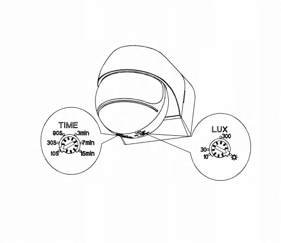 - TIME - регулювання часу освітлення: Ручка дозволяє визначити час, протягом якого пристрій працюватиме після спрацьовування датчика. Час освітлення відраховується з моменту виявлення руху до його вимкнення.