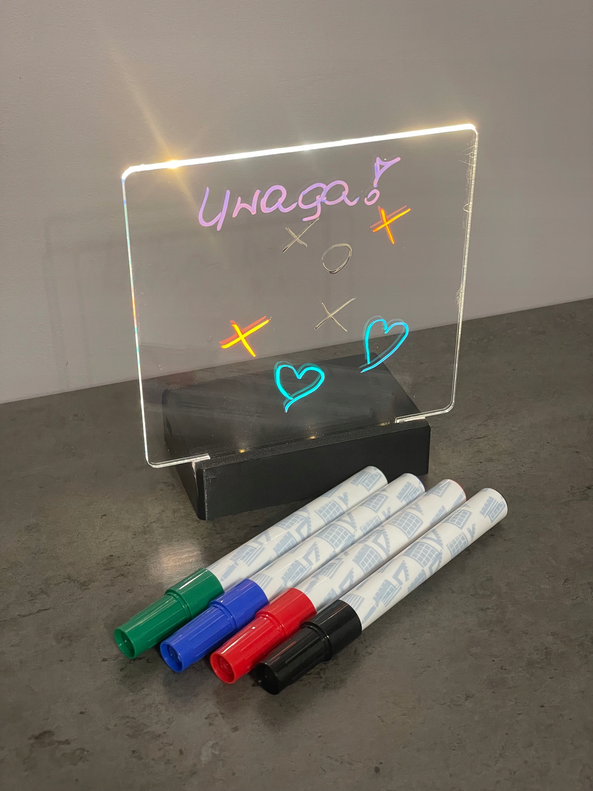 Світлодіодна лампа з оргскла для запису заміток тощо, в комплект входить 4 маркери, які видно на фото, які можна легко стерти з оргскла (рекомендується використовувати вологу серветку з мікрофібри, щоб не подряпати оргскло ). Стенд живиться від трьох батарейок типу АА, які в комплекті включають лише оргскло, розміри приблизно 145x145 мм і товщину 3 мм.