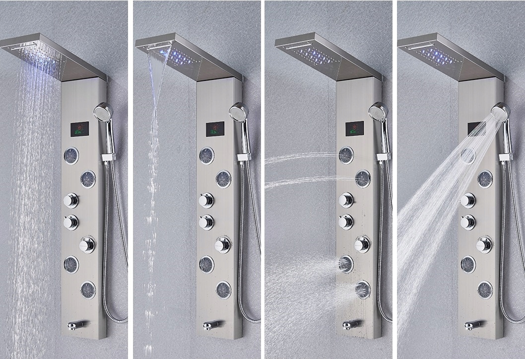 Панель з тропічним душем і гідромасажем містить усі необхідні елементи для встановлення у вашій ванній кімнаті, ванній кімнаті чи приватному SPA.