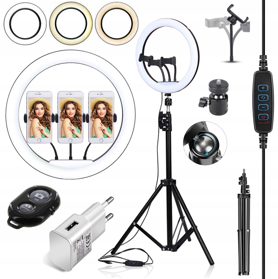 - працює з кільцевою світлодіодною лампою RING 100 Вт і з усіма телефонами та електронними аксесуарами