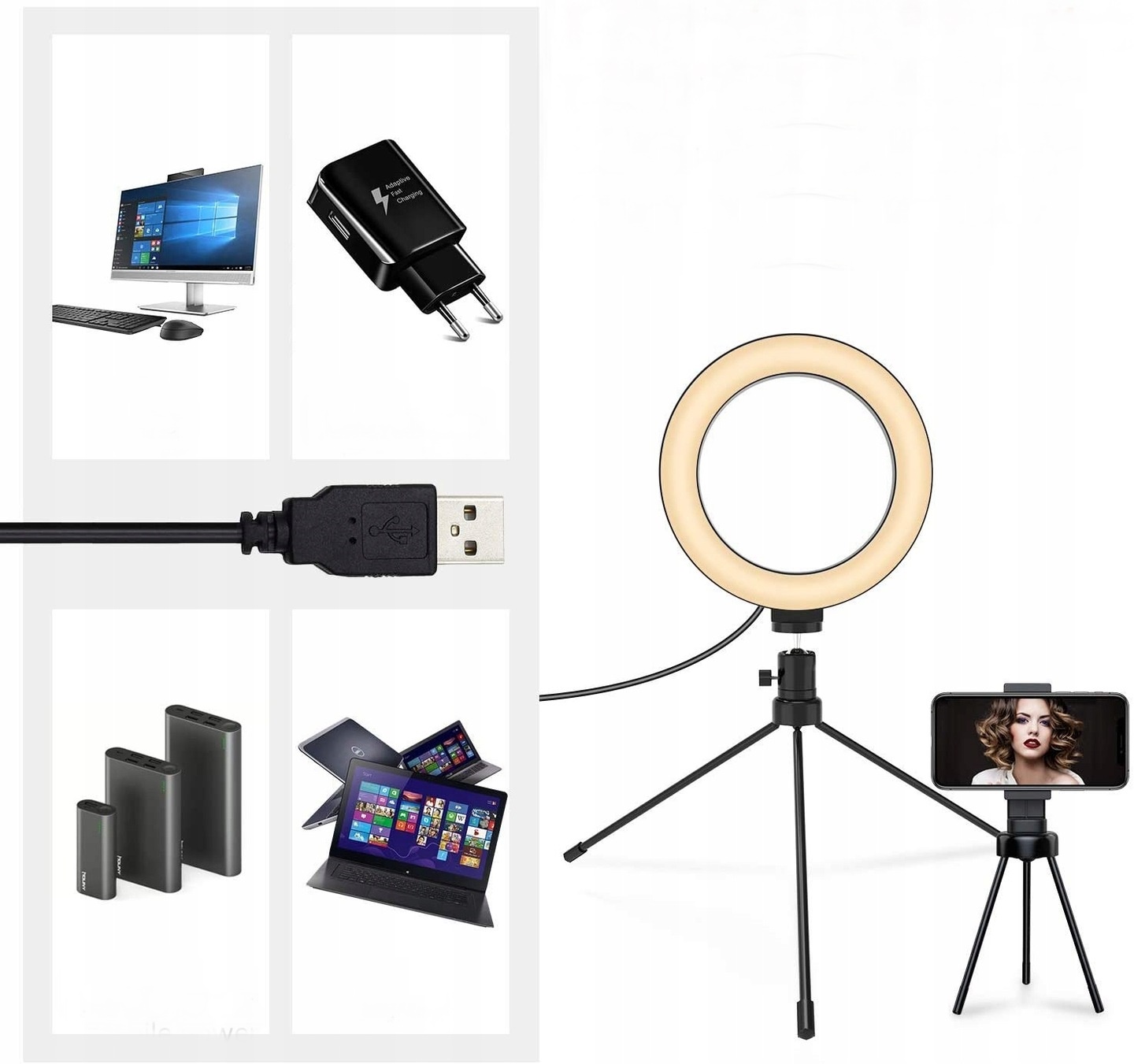 - Багатофункціональність: дизайн 2-в-1 поєднує в собі тримач телефону та кільце для селфі. Універсальна кулькова головка регульованого штатива дозволяє легко знайти ідеальний кут для освітлення об’єкта зйомки, фотографування чи прямої трансляції. Для всіх типів умов зйомки: кільцеве світло для запису відео YouTube, прямі трансляції TikTok, макіяж, онлайн-йога або фітнес, відеоконференції.