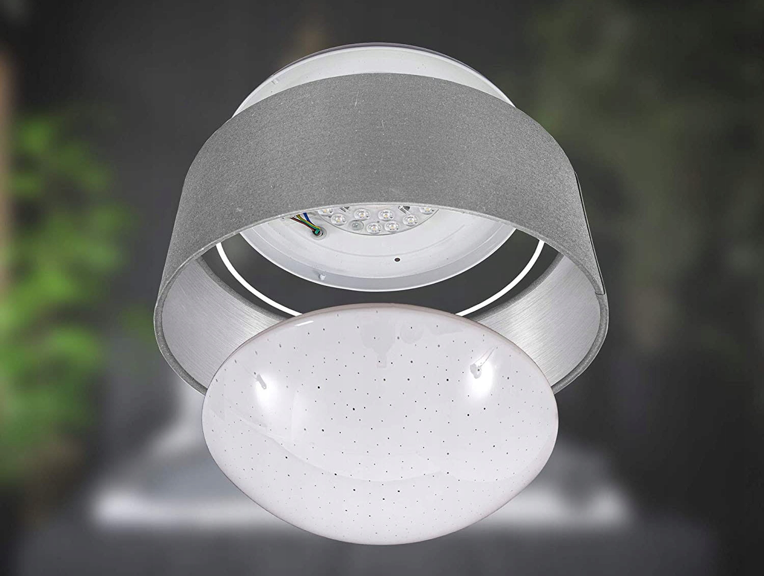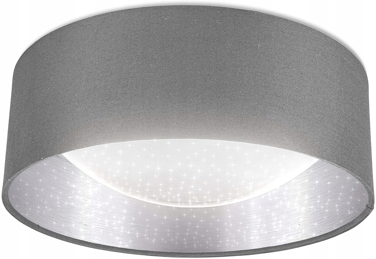 Стельовий світильник - стельовий світильник з металу та тканини. Джерелом світла є абажур, що створює ефект зоряного неба, який оточений тканинним абажуром із фактурною сріблястою фольгою зсередини та покритим тонкою сірою тканиною ззовні