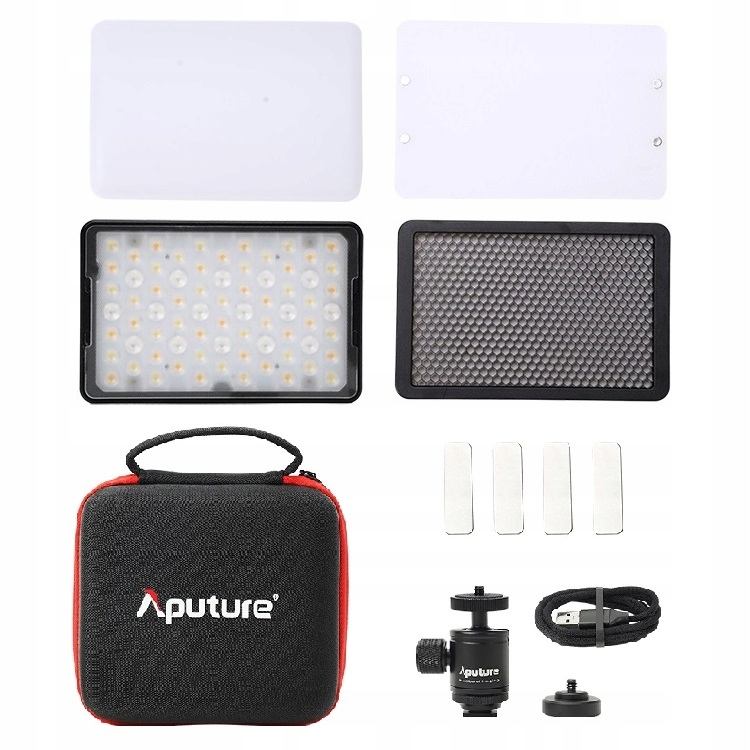 У набір входить світлодіодна лампа Aputure MC Pro, магнітний плоский розсіювач, магнітний купольний розсіювач, магнітна сітка («сота»), кріплення холодного башмака з кульовою головкою, магнітний адаптер 1/4, 4 метал. кріпильні пластини (самоклеючі), кабель USB-A / USB-C, жорсткий чохол на блискавці.