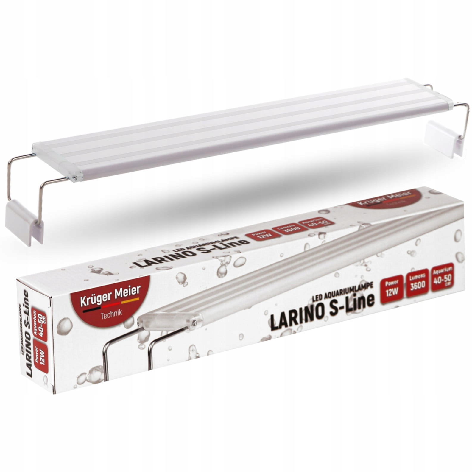 Kruger Meier Larino S-Line — це серія світлодіодних освітлювальних приладів із мікророзмірами та сучасним виглядом, присвячена акваріумам для прісноводних рослин. Лампи мають чудову світловіддачу завдяки енергозберігаючим діодам High Brightnes. Основне світло — комбінація білого 6500K, 7000K і 10000K. Крім того, лампа має сині світлодіоди, які надають рослинам більш яскравих кольорів.