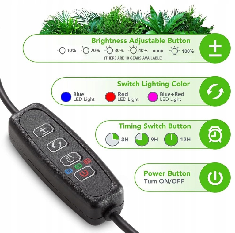 Лампа має вбудований таймер, який дозволяє встановити час освітлення на 3, 9 або 12 годин на добу. Завдяки цьому можна автоматизувати процес освітлення рослин, що дозволяє заощадити час і забезпечити їм регулярні умови освітлення.