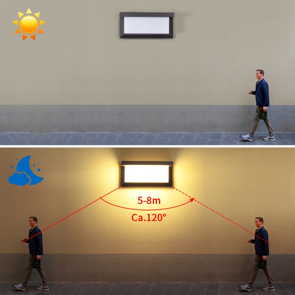 - Відстань виявлення становить1-8 метрівперед і позаду настінної лампи, а кут виявлення становить120°.
