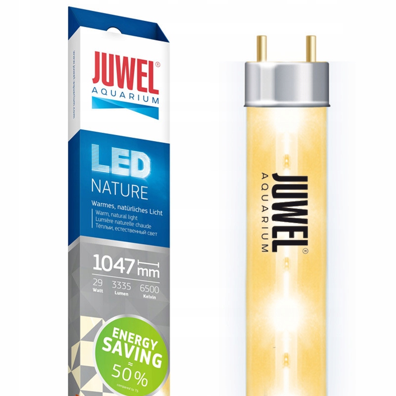 Енергозберігаюча люмінесцентна лампа LED Nature створює тепле та природне світло. Спеціальний спектр світла сприяє фотосинтезу рослин, підкреслюючи зелені кольори в акваріумі.
