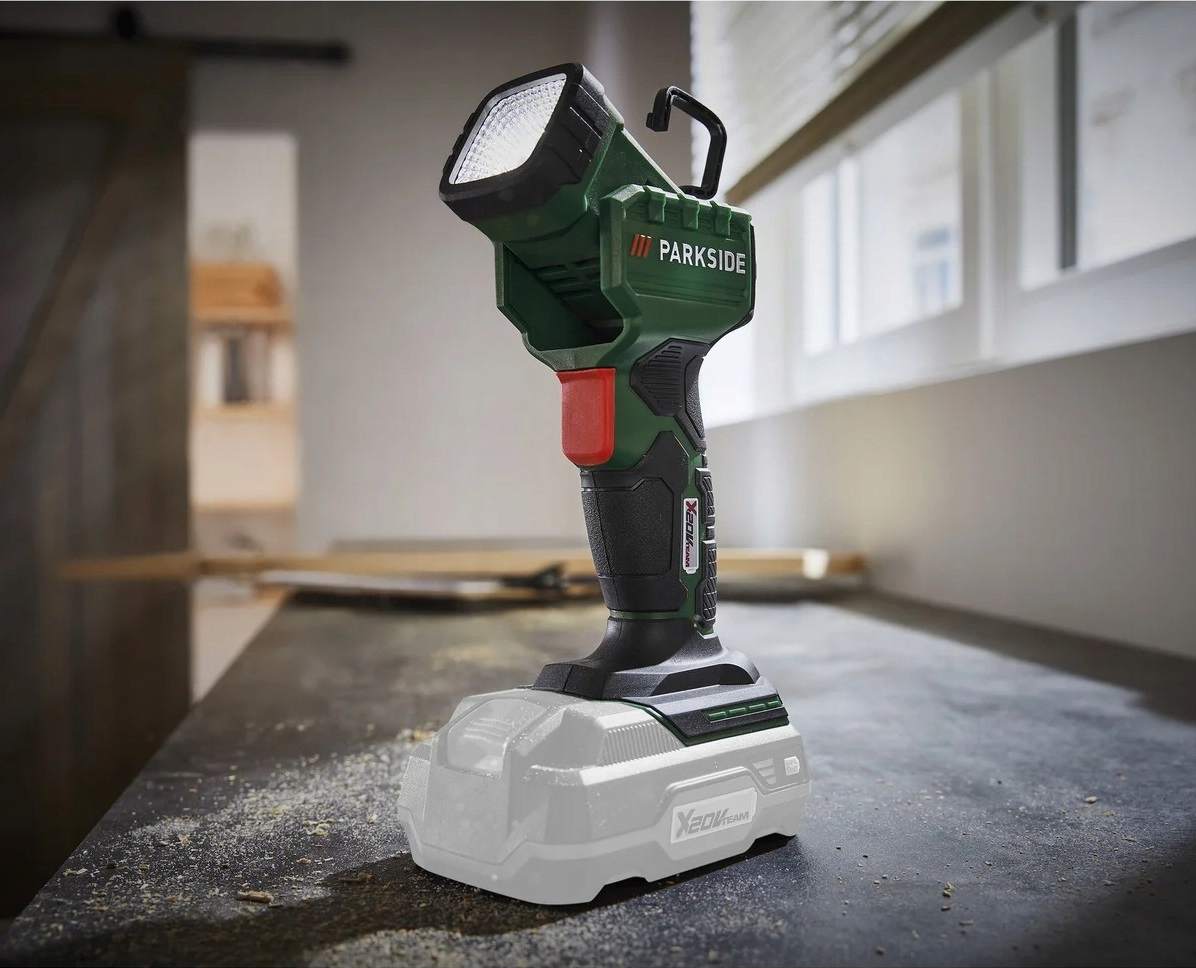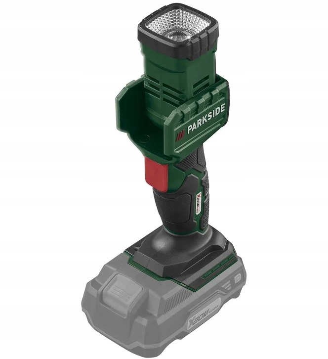 оснащена 12 кутами освітлення , регулюється з нахиленим освітлювальним елементом у діапазоні від -12 ° до 100 °. Блокування перемикача дозволяє вільно залишати лампу вільно, не натискаючи на комутатор. Parkside Plhla 20-Li A1-це лампа з не ковзаючою ручкою і обертовим гачком для підвіски.