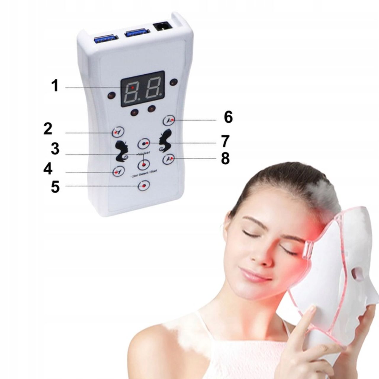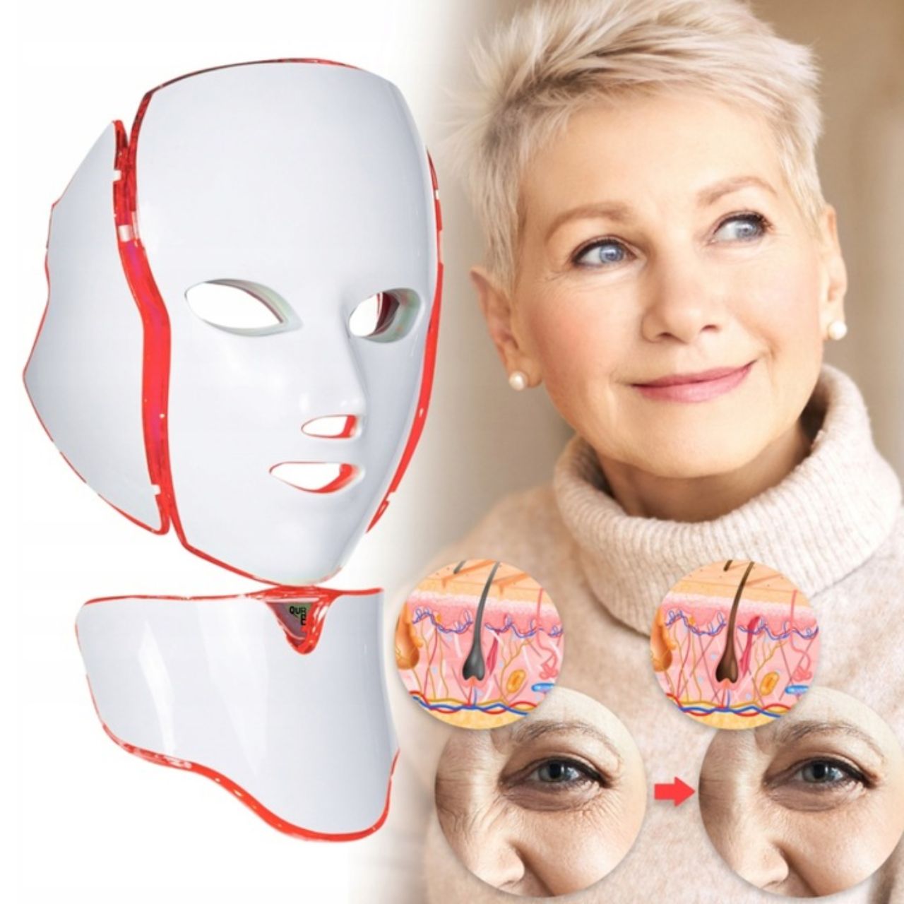 червоно -біле світло допомагає стимулювати вироблення колагену та еластину , що робить шкіру більш твердою, гнучкою та гладкою . Завдяки цьому зморшки стають менш помітними , а колір обличчя виглядає молодшим і сяюче.