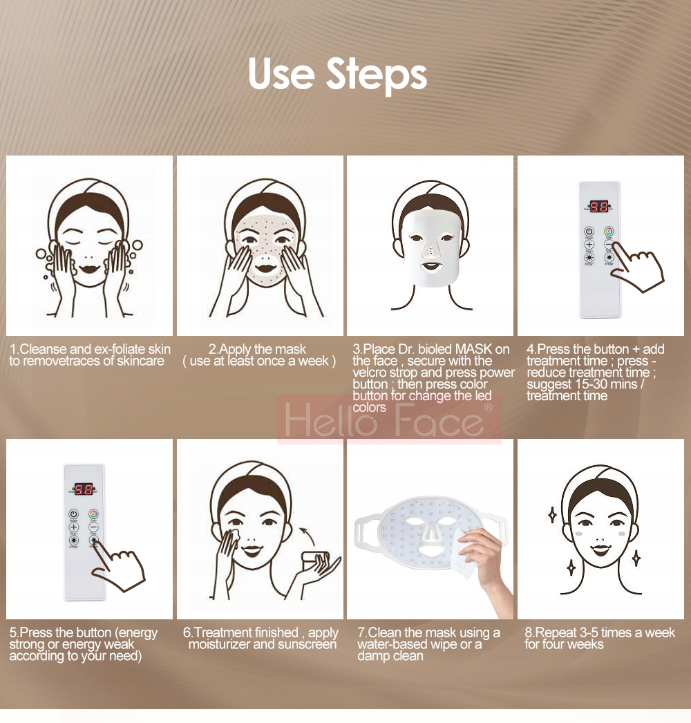 - Підготовка шкіри: перед нанесенням маски ретельно очистіть обличчя, щоб видалити макіяж, забруднення та жир. Ви також можете використовувати легкий пілінг, щоб видалити мертві клітини шкіри та підвищити ефективність світлодіодного світла.