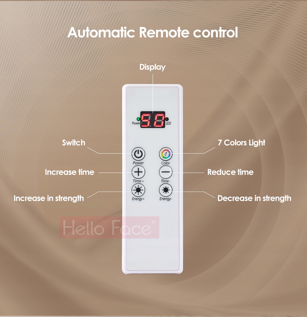 Пульт дистанційного керування, що входить до світлодіодної маски Hello Face, є пристроєм, який полегшує керування та персоналізацію догляду. У верхній частині пульта дистанційного керування є цифровий дисплей, який показує тривалість сеансу. Під дисплеєм є кнопки для керування функціями маски: