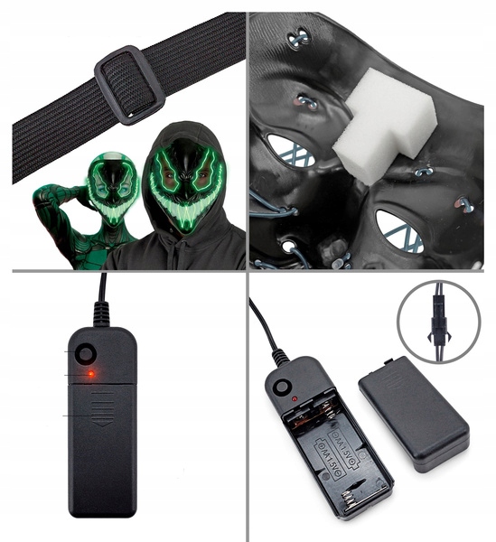 - Чорна маска з вражаючим зеленим світлодіодним підсвічуванням, що створює легкий візерунок на обличчі - справляє величезне враження! Він адаптується до обличчя і не ковзає вниз під час носіння.