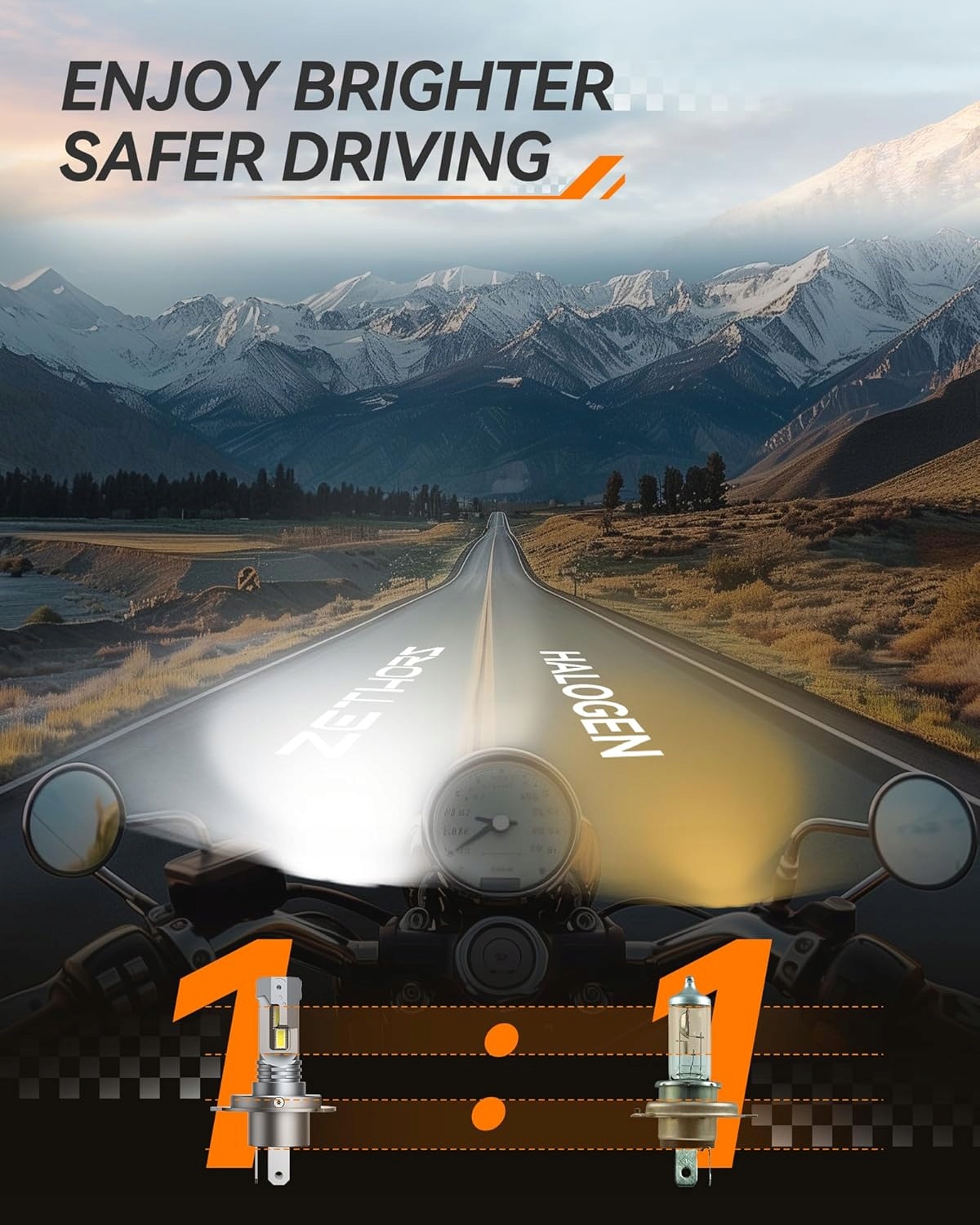 - Мотоциклетна лампа Zethors LED H4 зменшує відбиття світла та водночас забезпечує достатню яскравість, інтенсивність світла на 400% вища, ніж у галогенної лампи H4. Клас захисту IP68, водонепроникність і пилонепроникність, забезпечують кришталево чітку видимість навіть у найгірших умовах на льоду, снігу чи піску та освітлюють дорогу.