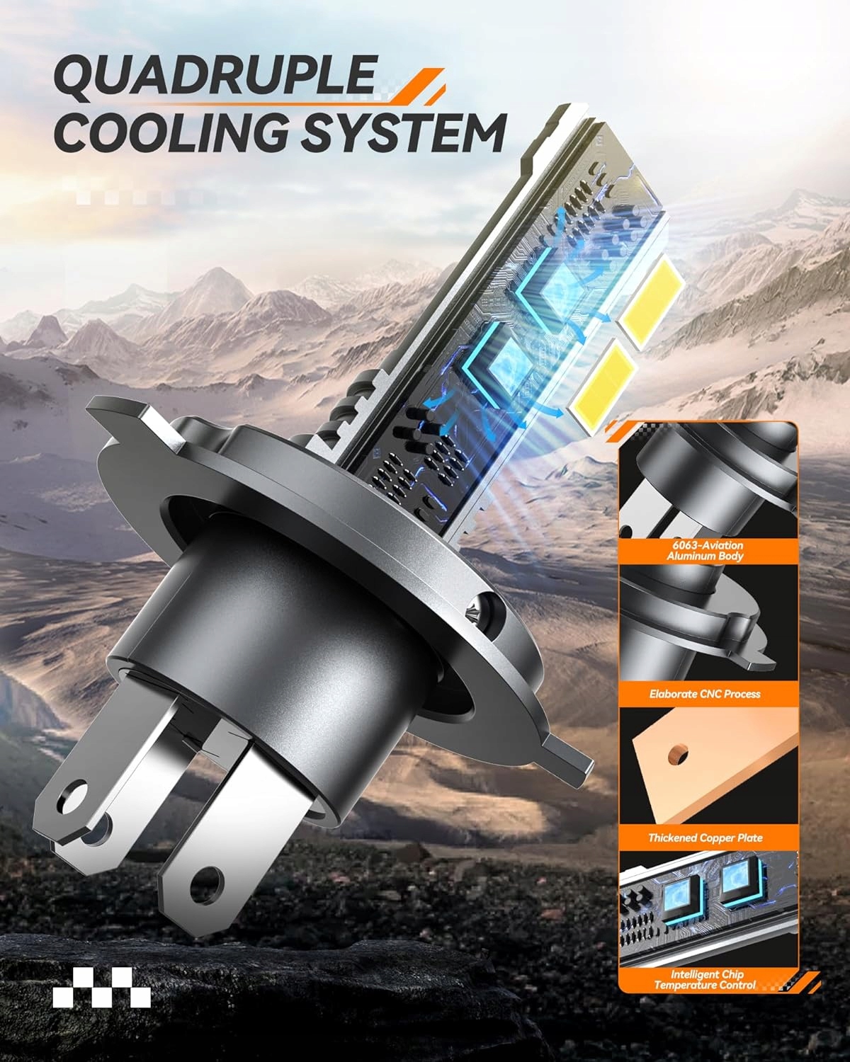 - Світлодіодні фари для мотоциклів Zethors H4 мають функцію швидкого старту, яка безпосередньо досягає максимальної яскравості без необхідності прогріву, що забезпечує безпеку. Інтеграція системи контролю температури та охолодження смарт-карт, як-от посилених мідних пластин і високоякісного алюмінієвого корпусу з ЧПК 6063, сприяє інтелектуальному управлінню температурою для надійної роботи та тривалого терміну служби світлодіода H4.