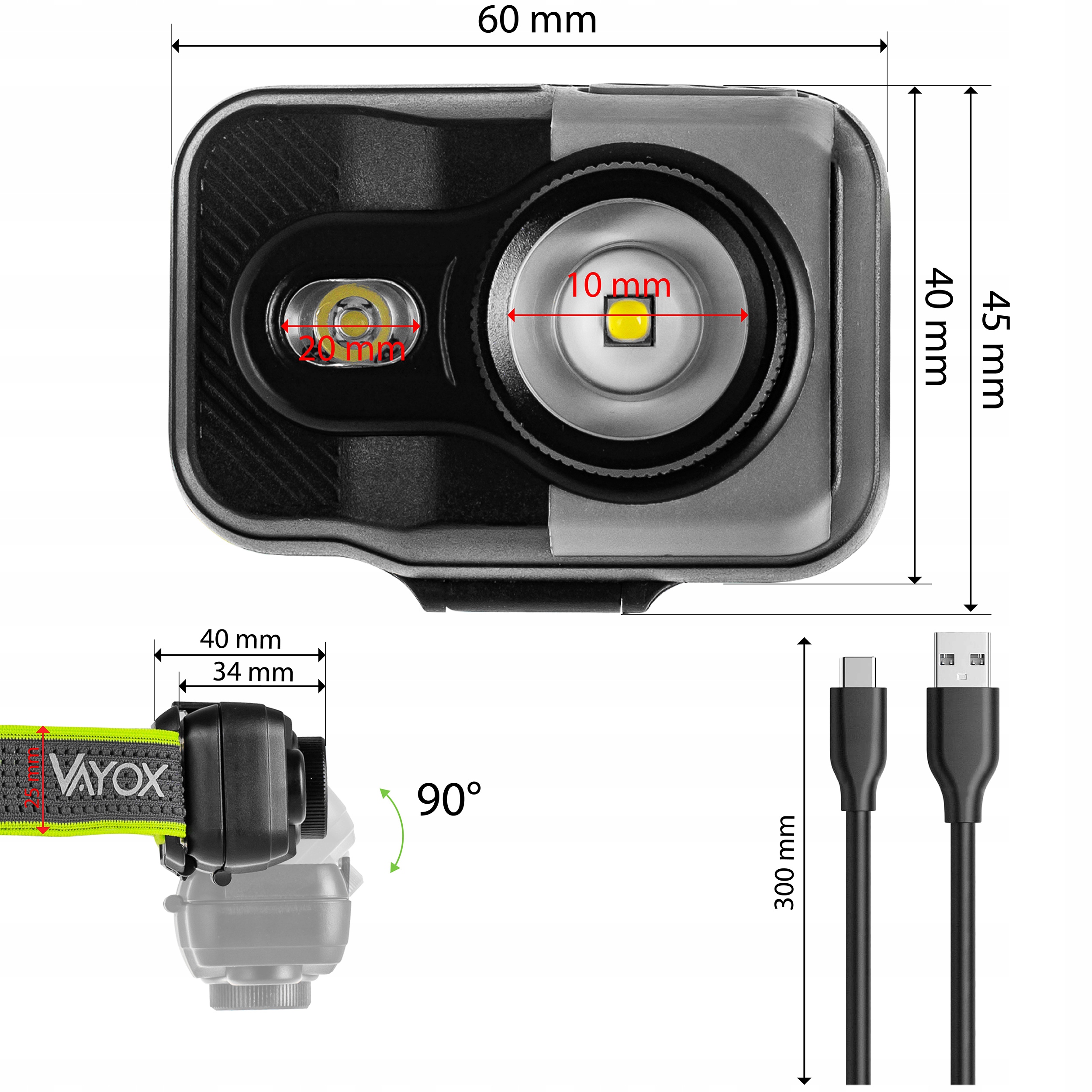 - Акумулятор 3,7 В, кабель USB-C, ліхтарик VA0196, наголов'я, оригінальна упаковка