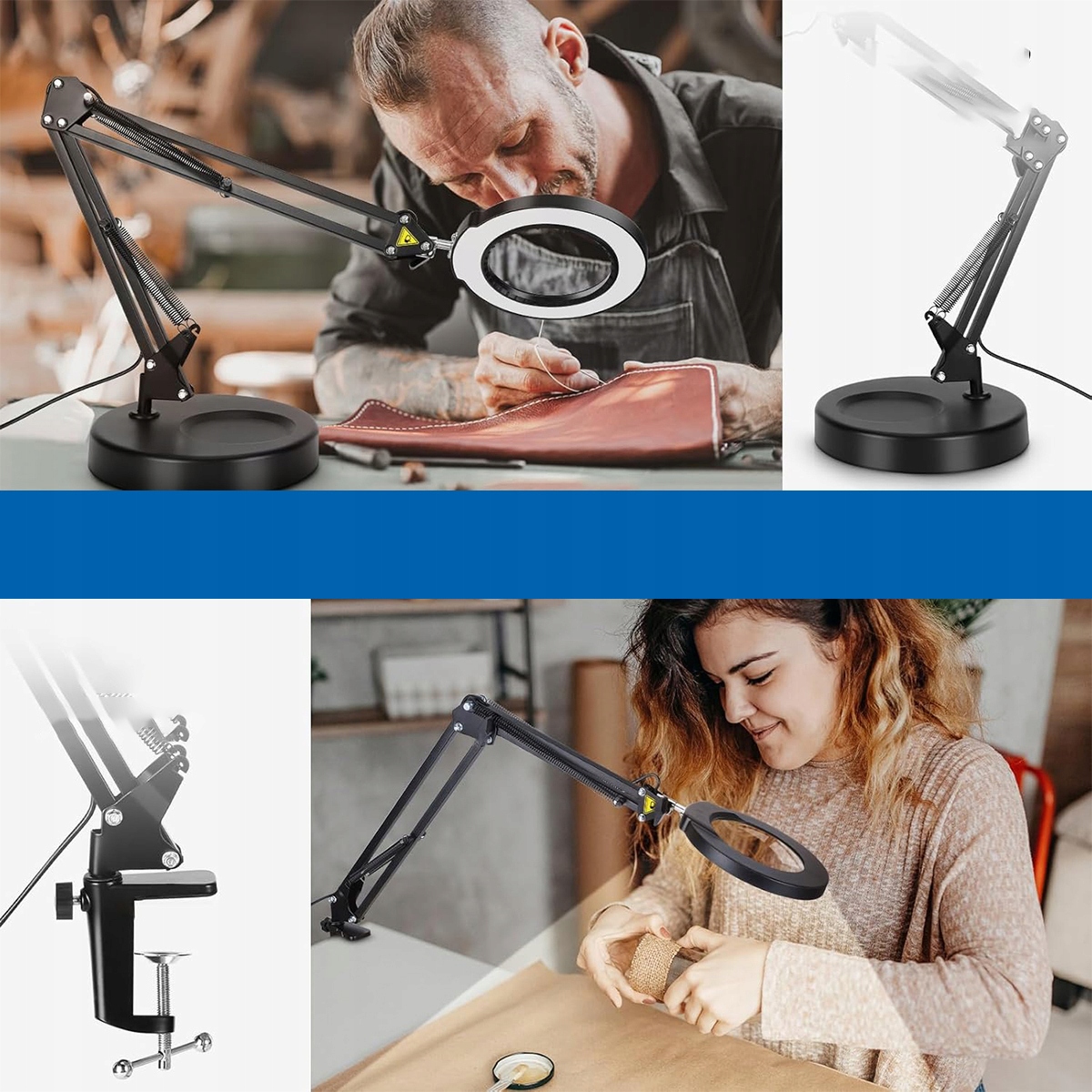 Гнучка конструкція обертової руки: освітлювальний лукавець, що дозволяє зробити саморобку без використання рук, оснащений двома крутими плечами, 3 кнопками та 4 пружинами. Обертову руку можна подовжити до 50 см / 20 дюймів, а ручка та обертова рука зберігають лупу на місці, залишаючи руки абсолютно вільними. Голову лампи, що обертається на 360 градусів, можна встановити під будь -яким кутом, залежно від потреб.