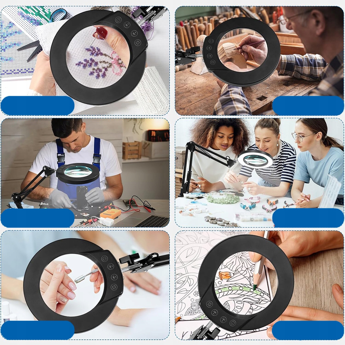 Кнопка дотику на головці лампи: на відміну від інших продуктів з дротовим вимикачем, наш продукт покращив кнопку сенсорного комутатора на головці лампи. Кнопка комутатора легко доступна, ви можете легко керувати збільшувальним світлом, вам більше не потрібно дивитись вниз, щоб знайти шнур живлення для управління перемикачем, що забезпечує зручність під час ремонту, виготовлення ювелірних виробів, читання, паяльних робіт та інших робіт, виконаних поруч.