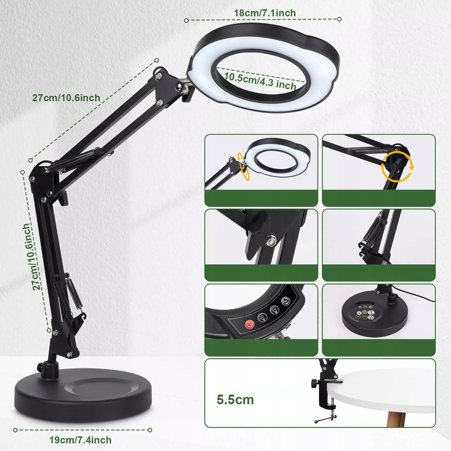 - 🔎Завдяки гнучкому дизайну поворотного кронштейна ви можете вільно висувати його, щоб міцно тримати лупу на місці, залишаючи ваші руки повністю вільними. Головка лампи обертається на 360° і може бути встановлена під будь-яким кутом залежно від ваших потреб.