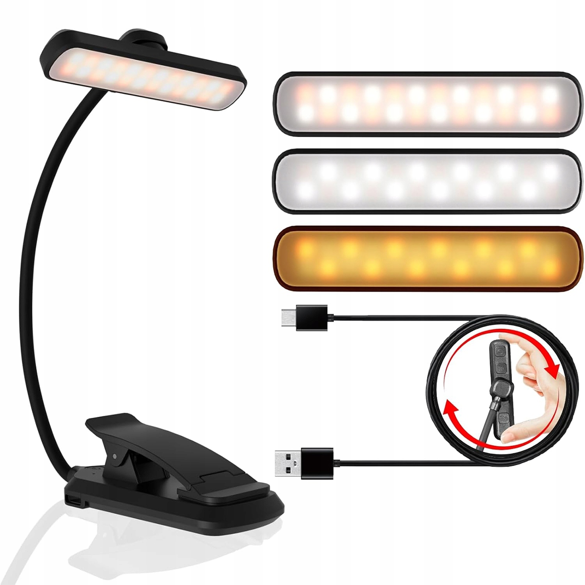 Лампа для читання YOUKUKE із тримачем для книг, перезаряджається через USB-C, з регулюванням яскравості, з 24 світлодіодами, 3 режимами колірної температури та 5 рівнями яскравості, лампа для читання із захистом для очей, 1000 мАг, поворотна на 315° лампа для читання та подорожей (чорна)