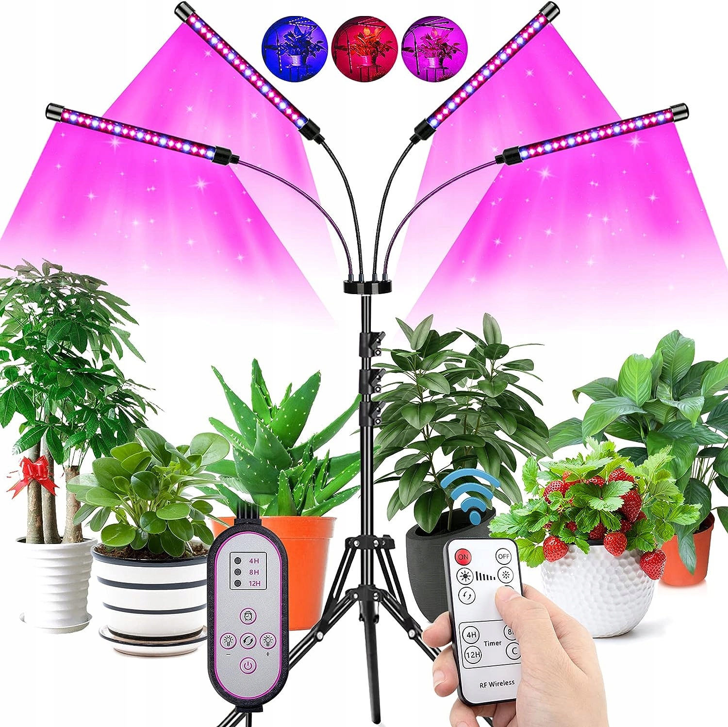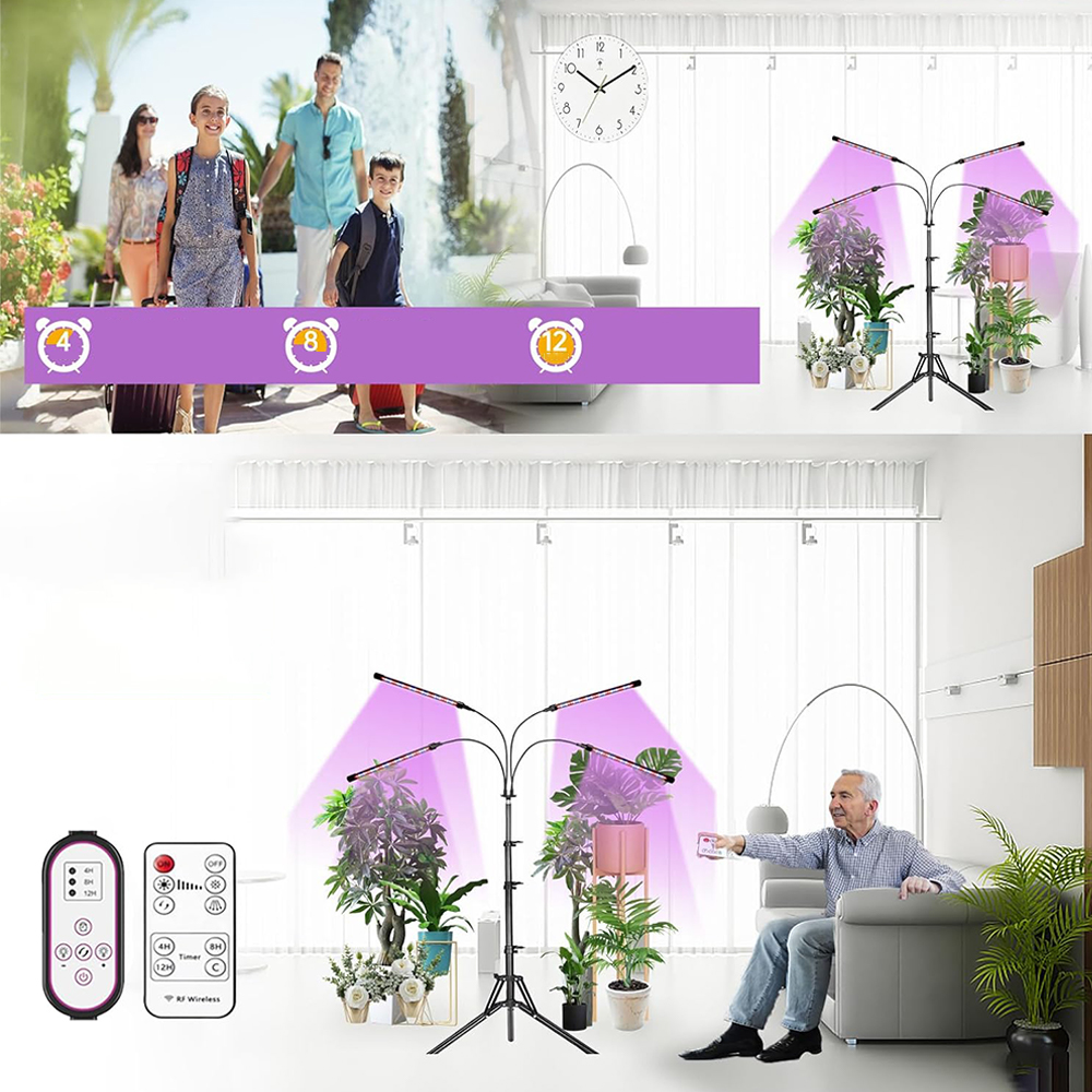 - 🌲 - Ця лампа b>Grow постачається як з контролером лінійного входу, так і з радіочастотним контролером (у радіусі 30 метрів). Вони можуть бути налаштовані на 4H/8H/12H автоматичне освітлення, автоматичне вмикання/вимкнення та більше не ручне керування щодня. Кожну світлодіодну головку можна окремо вмикати та вимикати