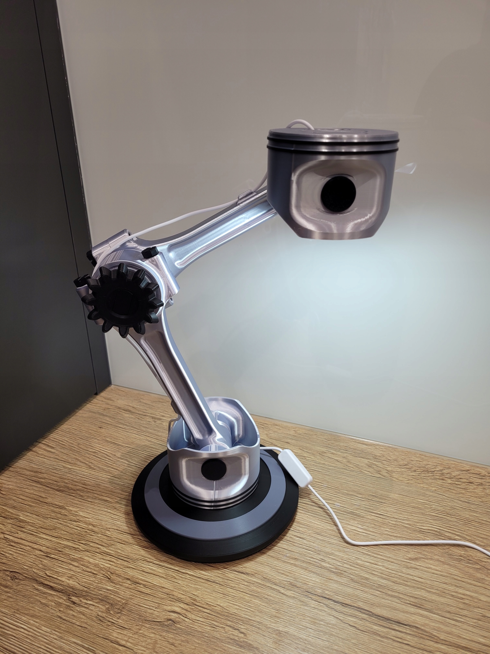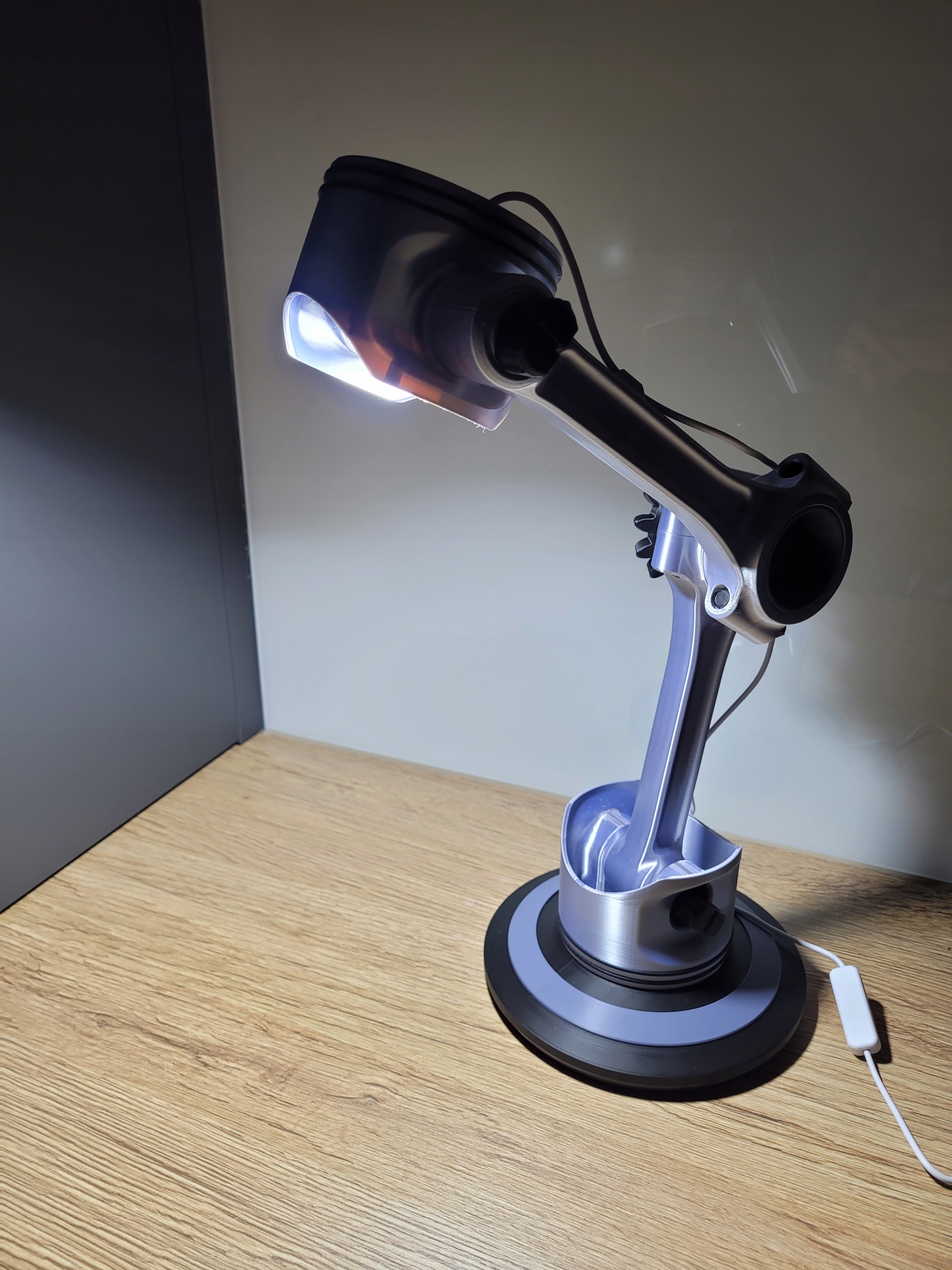 Настільна лампа для кожного шанувальника та ентузіаста автомобільної промисловості. Стилізований під поршні двигуна внутрішнього згоряння. Металізована поверхня поршнів і шатунів виглядає як справжній метал. Багато деталей, в тому числі кільця на поршнях.