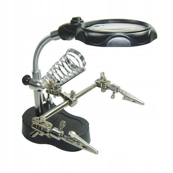має важку позицію, забезпечуючи високу стабільність під час роботи. Оснащений двома крокодилами для фіксації, наприклад Плитка на друковці та лупа з діаметром 62 мм та збільшенням 3,5 разів та 12 разів, що полегшують роботу з невеликими елементами.