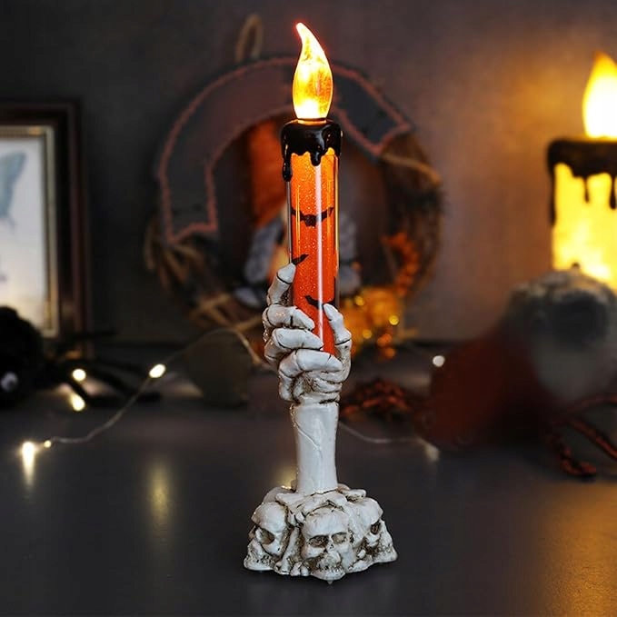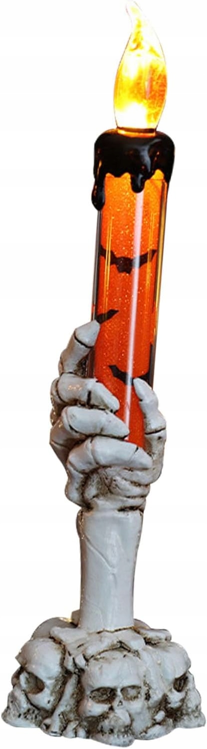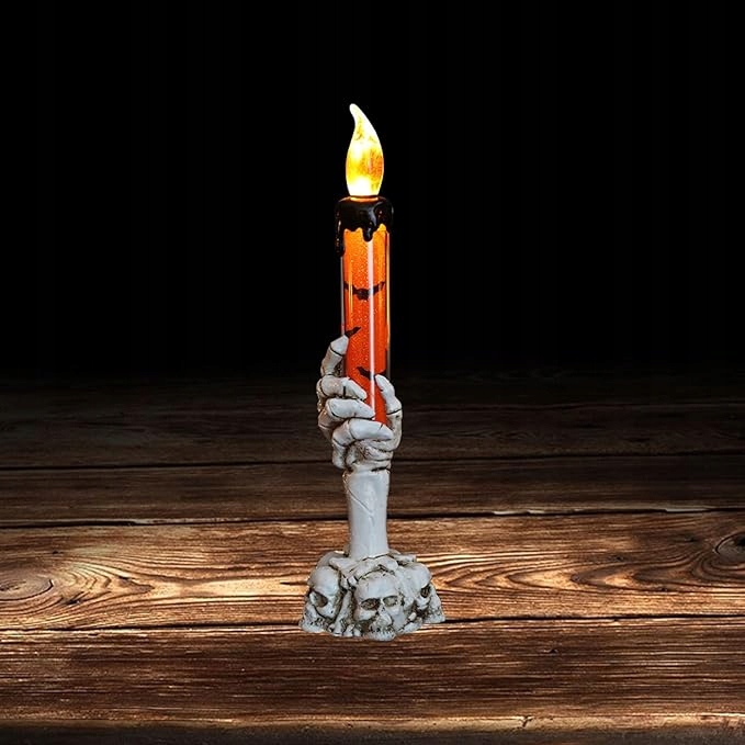 Декоративна світлодіодна свічка – рука-скелет із черепами | 21 см | Апельсин | Працює від батарейок