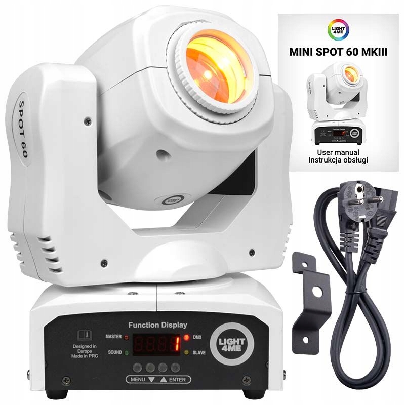 Прожектор Light4Me Mini Spot 60 MKIII оснащено потужним білим світлодіодом 60 Вт, який генерує яскравий і виразний світловий проміньі високоякісна лінза, яка розсіює світло під кутом 10 градусів. Завдяки вбудованому ✅ колесу кольорів і колесу гобо ми можемо легко отримати яскраві, насичені кольори та характерні та цікаві візерунки, які ідеально доповнюють наше шоу.