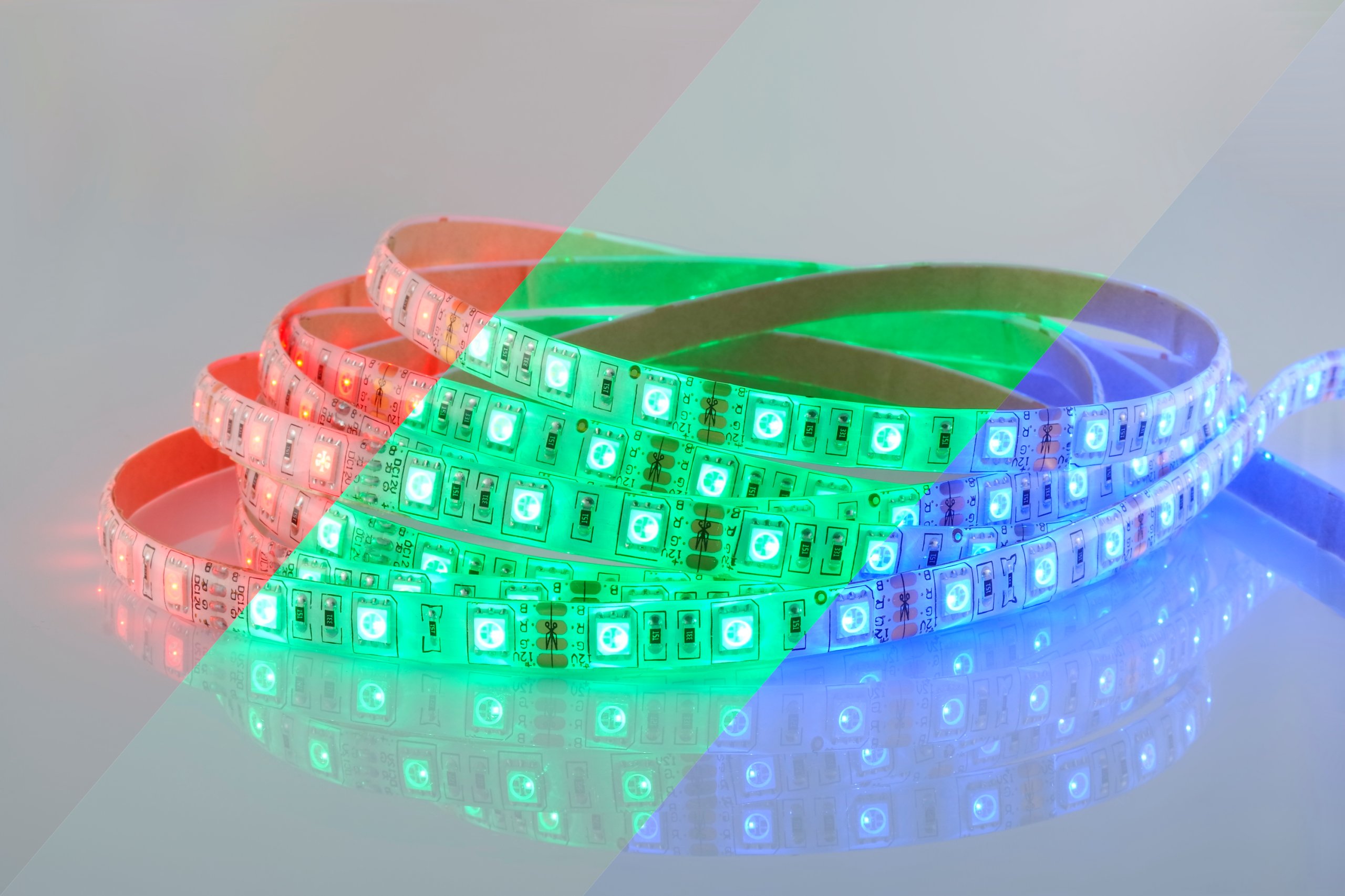 - Багатобарвність - кольоровий світлодіод може світити будь-яким кольором - червоний, синій, зелений, суміш цих кольорів і холодного білого. Білий колір у RGB-стрічках виходить шляхом змішування червоного, зеленого та синього.