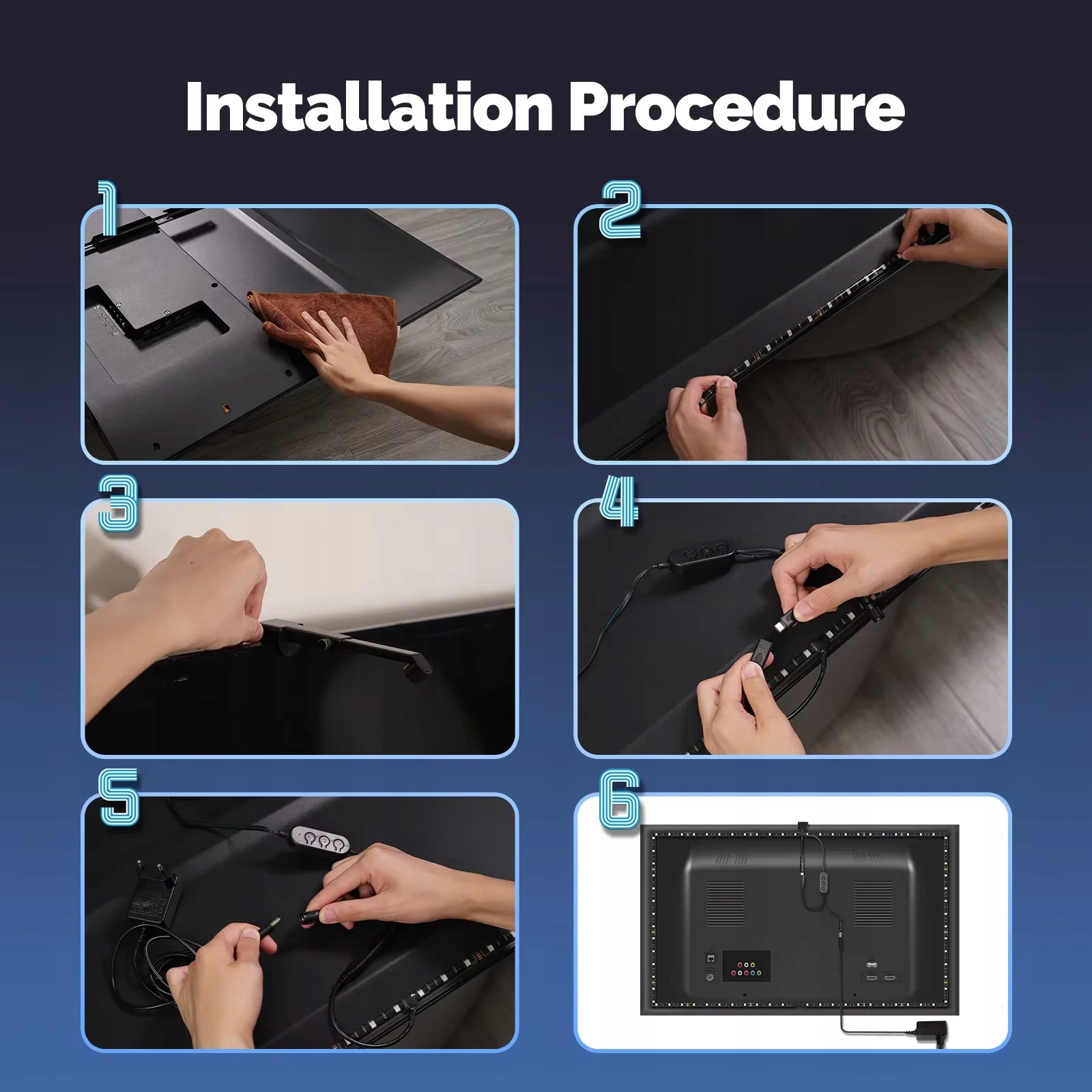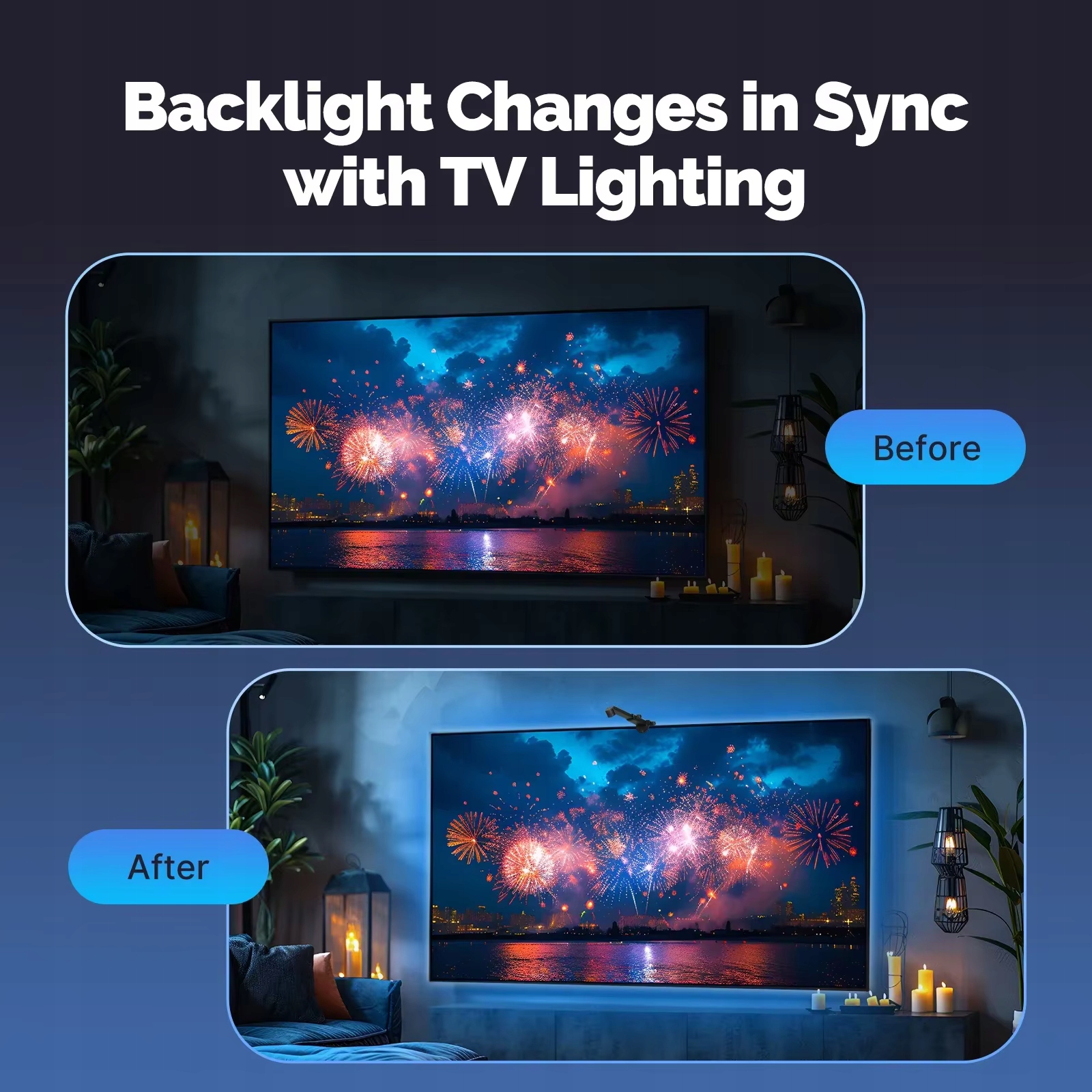 3️⃣ Захоплююче візуальне освітлення синхронізується із зображенням, що відображається на телевізорі, у режимі реального часу – подивіться різницю «До/Після»! Глибина й ефект занурення, як у справжньому кінотеатрі.