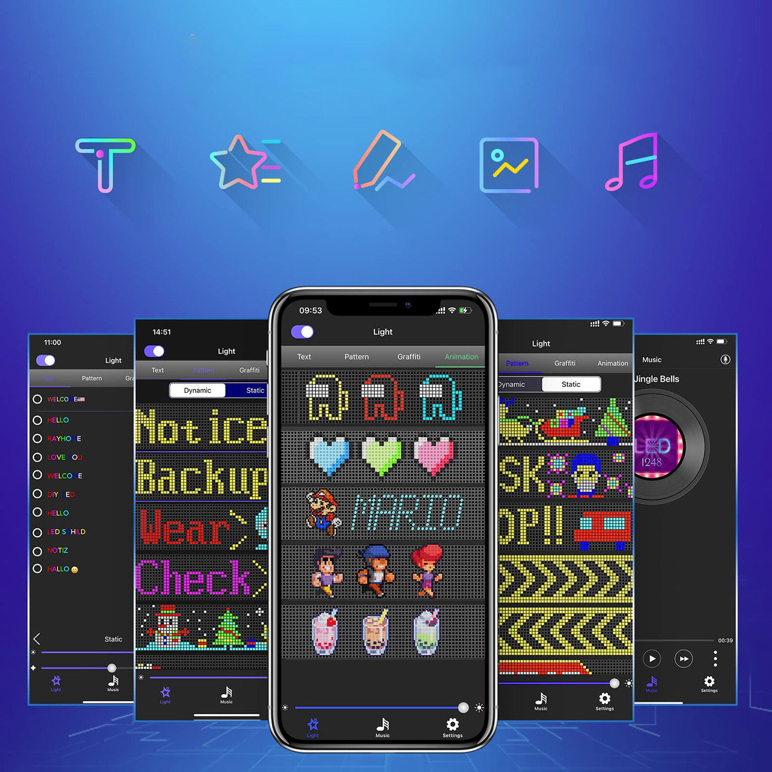 Керування через мобільний додаток?Програмована світлодіодна сенсорна панель проста у використанні. Завантажте програму на телефон і підключіться до LED-матричної панелі через Bluetooth. Керуйте м'яким світлом екрану з динамічним малюнком очей. Ви можете самостійно розробити такі функції, як редагування тексту, намальовані вручну графіті, анімація, ритм музики та налаштування яскравості тощо.