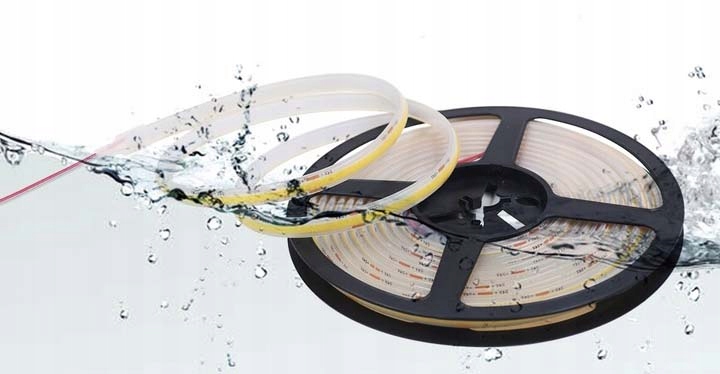Ми пропонуємо професійну світлодіодну стрічку COB у термококоновому покритті, ідеальну для застосування в місцях, які піддаються впливу вологи, наприклад, у саунах, ванних кімнатах, басейнах, ставках, фасадах тощо.