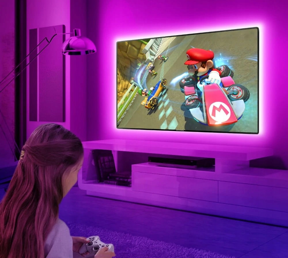 Світлодіодна стрічка для освітлення телевізора, комп’ютера, RTV обладнання, меблів, стін тощо. Стрічка створить дивовижну атмосферу в кімнаті завдяки ефекту «ambiciouslight». Чудовий візуальний ефект для сучасного інтер'єру. Телевізор з підсвічуванням не напружує очі під час перегляду, тому немає необхідності включати додаткове світло. Стрічка використовується як декоративне освітлення. Контролер має різноманітні програми, які створять ідеальну атмосферу в будь-якій кімнаті.