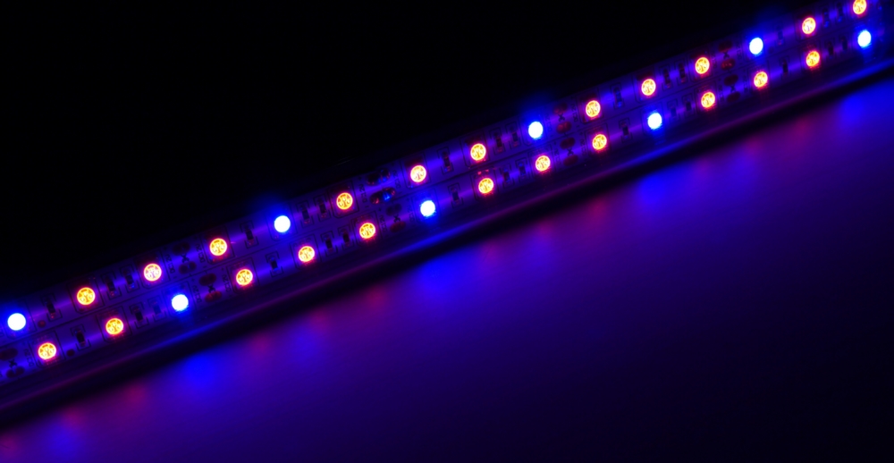 - Лумінесцентна лампа на основі червоних і синіх діодів SMD 5050 у співвідношенні 3:1 (3 червоні, 1 синій, 3 червоні, 1 синій тощо)